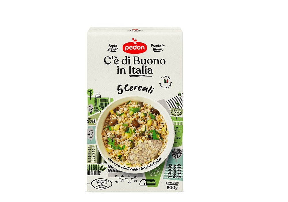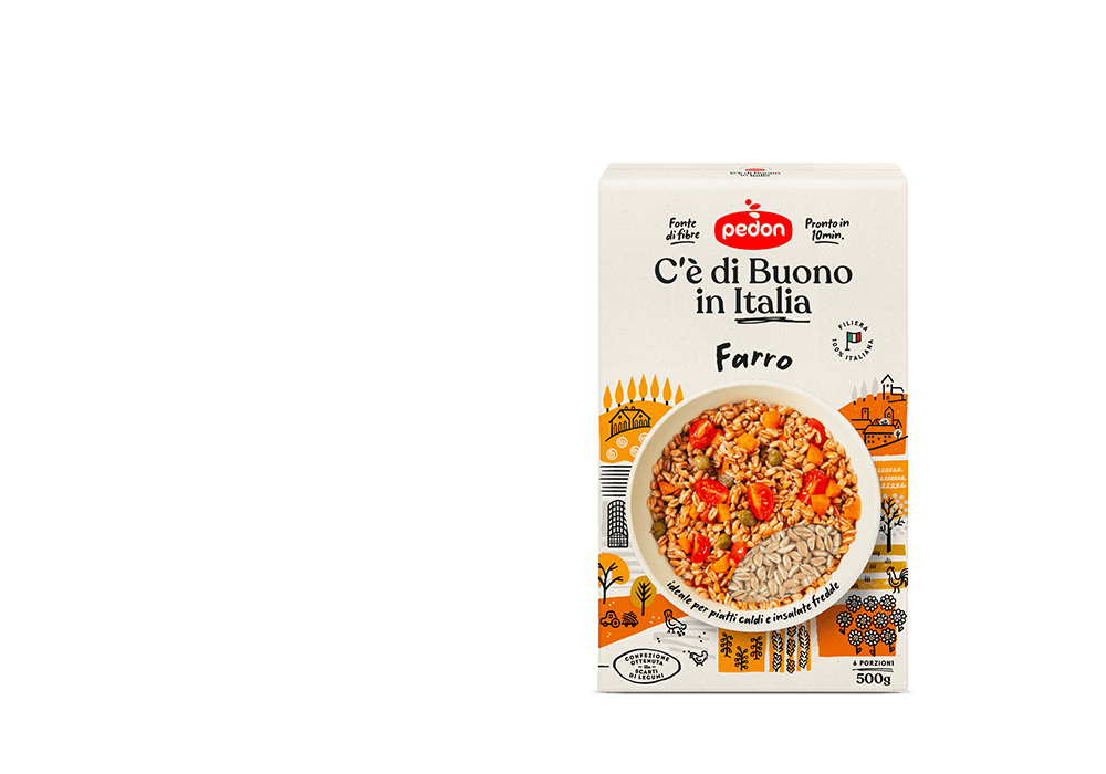 Cereali pronti in 10 minuti, da filiera 100% italiana, confezionati in carta completamente sostenibile e riciclabile proveniente dagli scarti dei legumi secondo il progetto “dal legume nasce un pack”.